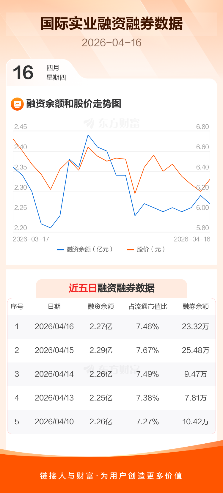 交易所最新数据显示,国际实业于2026年4月16日获融资买入515.22万元,融资偿还695.85万元,当日融资净偿还180.63万元。目前,该股融资余额2.27亿,占流通市值比例为7.46%。