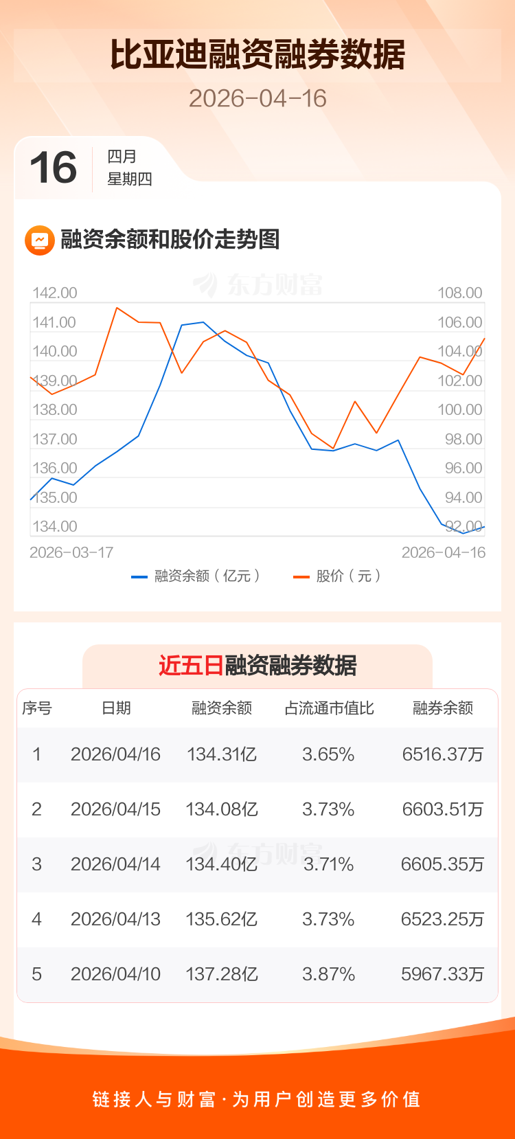 交易所最新数据显示,比亚迪于2026年4月16日获融资买入6.27亿元,融资偿还6.04亿元,当日融资净买入2346.74万元。目前,该股融资余额134.31亿,占流通市值比例为3.65%。