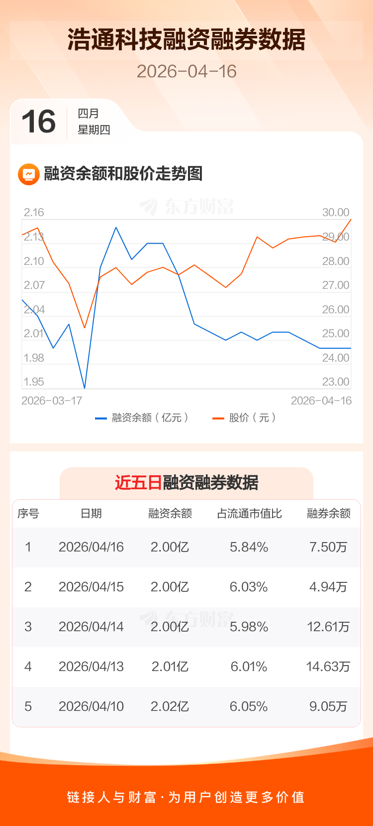 交易所最新数据显示,浩通科技于2026年4月16日获融资买入1719.01万元,融资偿还1724.79万元,当日融资净偿还5.78万元。目前,该股融资余额2.00亿,占流通市值比例为5.84%。