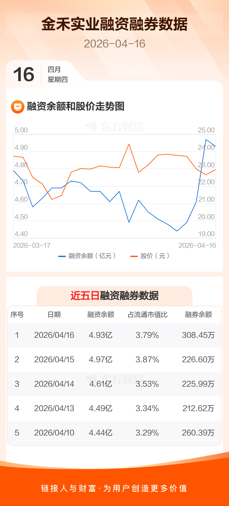 交易所最新数据显示,金禾实业于2026年4月16日获融资买入1724.90万元,融资偿还2139.16万元,当日融资净偿还414.26万元。目前,该股融资余额4.93亿,占流通市值比例为3.79%。