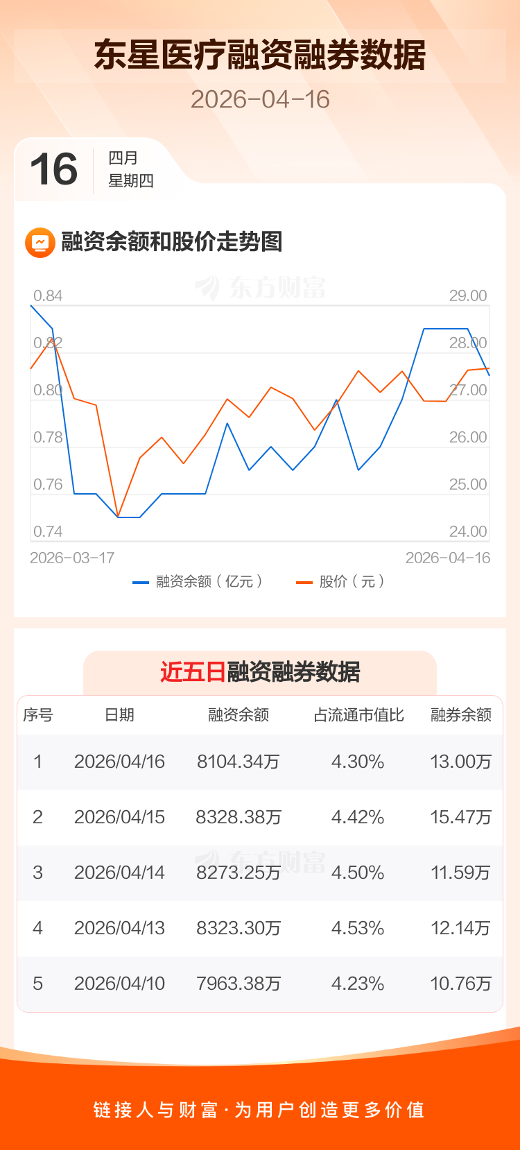 交易所最新数据显示,东星医疗于2026年4月16日获融资买入431.47万元,融资偿还655.51万元,当日融资净偿还224.03万元。目前,该股融资余额8104.34万,占流通市值比例为4.30%。