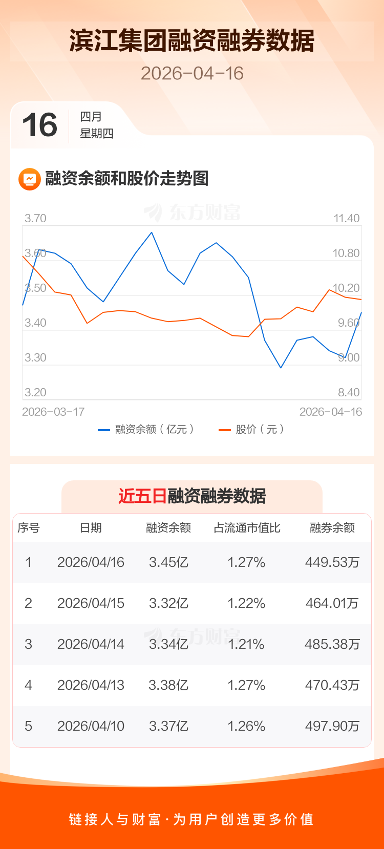交易所最新数据显示,滨江集团于2026年4月16日获融资买入3023.10万元,融资偿还1694.06万元,当日融资净买入1329.04万元。目前,该股融资余额3.45亿,占流通市值比例为1.27%。