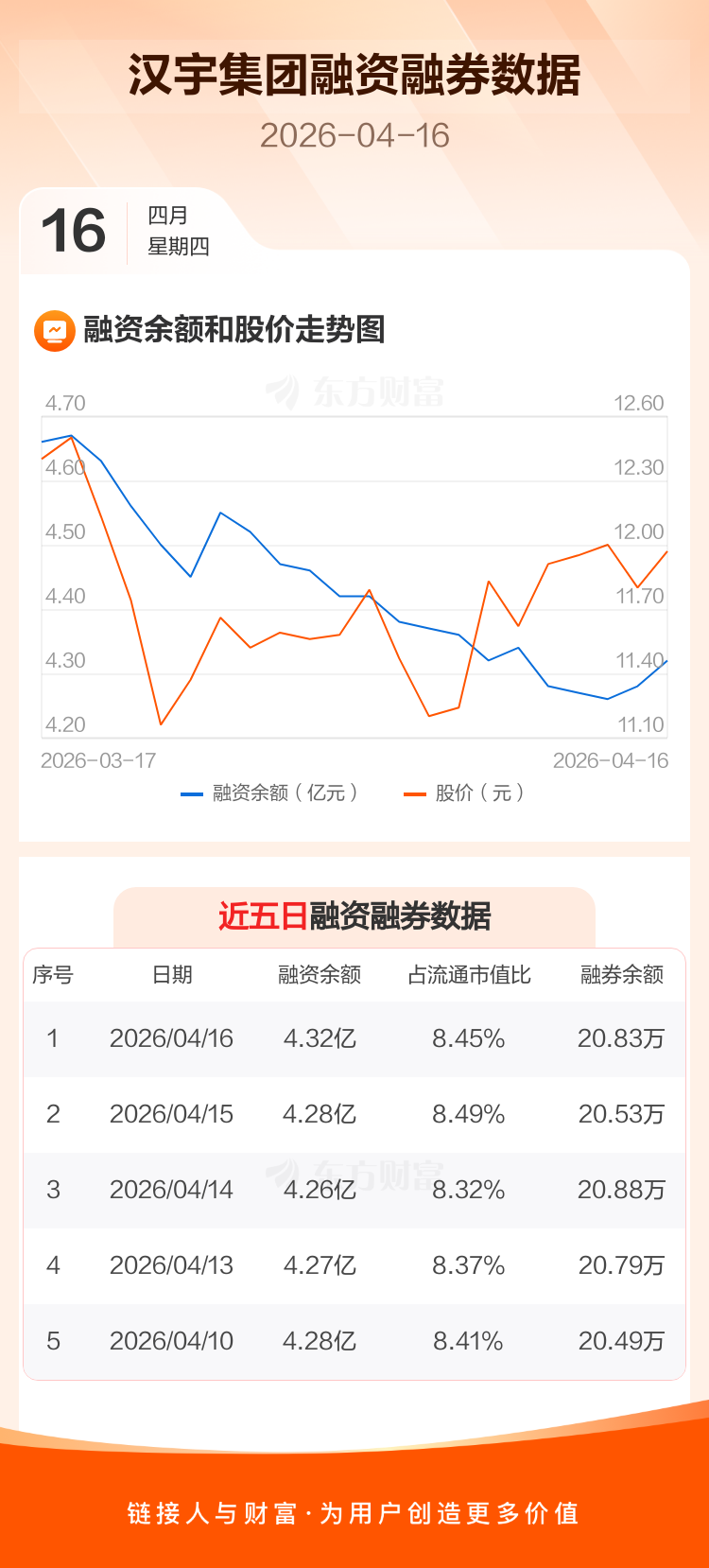交易所最新数据显示,汉宇集团于2026年4月16日获融资买入1842.02万元,融资偿还1431.83万元,当日融资净买入410.19万元。目前,该股融资余额4.32亿,占流通市值比例为8.45%。