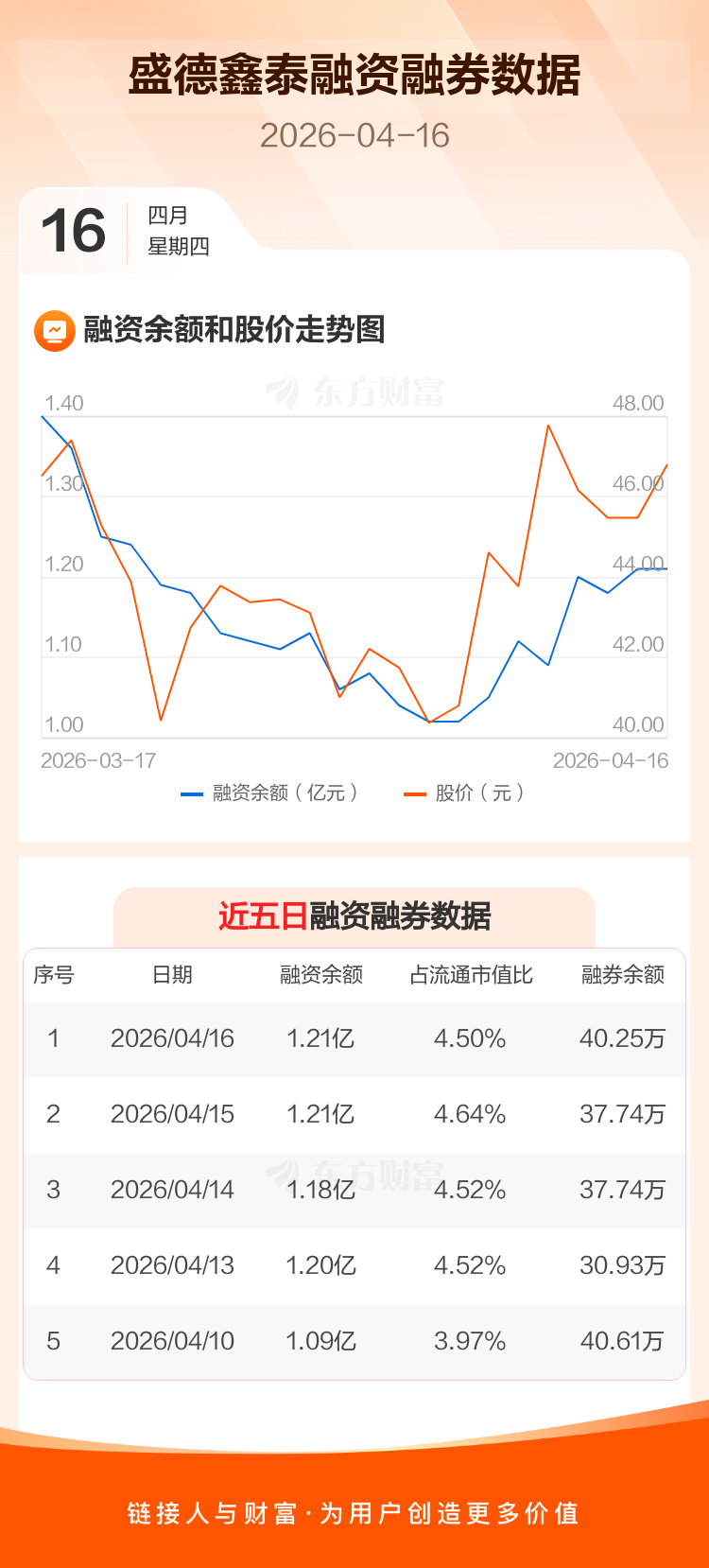 交易所最新数据显示,盛德鑫泰于2026年4月16日获融资买入2038.14万元,融资偿还2049.06万元,当日融资净偿还10.93万元。目前,该股融资余额1.21亿,占流通市值比例为4.50%。