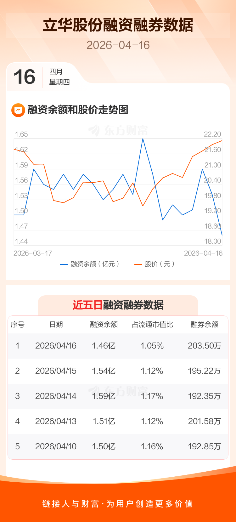 交易所最新数据显示,立华股份于2026年4月16日获融资买入1062.63万元,融资偿还1835.80万元,当日融资净偿还773.16万元。目前,该股融资余额1.46亿,占流通市值比例为1.05%。