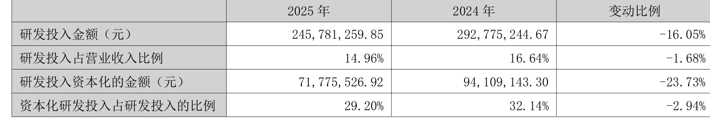 2025年全年,公司研发投入金额为2.46亿元,同比下降16.05%;研发投入占营业收入比例为14.96%,相比上年同期下降1.68个百分点。此外,公司全年研发投入资本化率为29.2%。