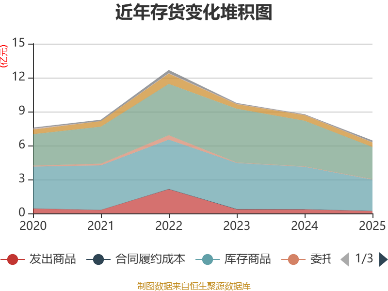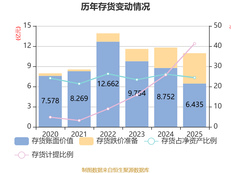 从存货变动来看,截至2025年末,公司存货账面价值为6.44亿元,占净资产的24.39%,较上年末减少2.32亿元。其中,存货跌价准备为4.52亿元,计提比例为41.25%。