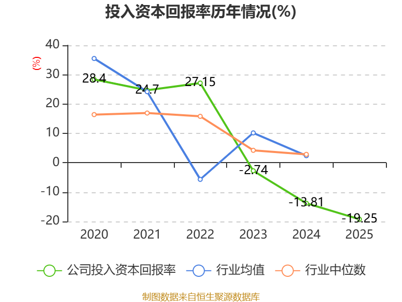 数据显示,2025年公司加权平均净资产收益率为-24.46%,较上年同期下降7.44个百分点。公司2025年投入资本回报率为-19.25%,较上年同期下降5.44个百分点。
