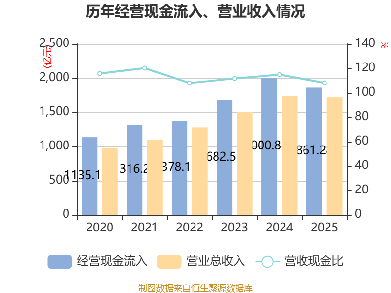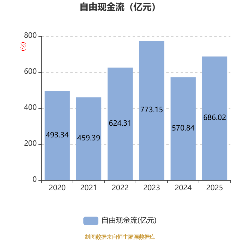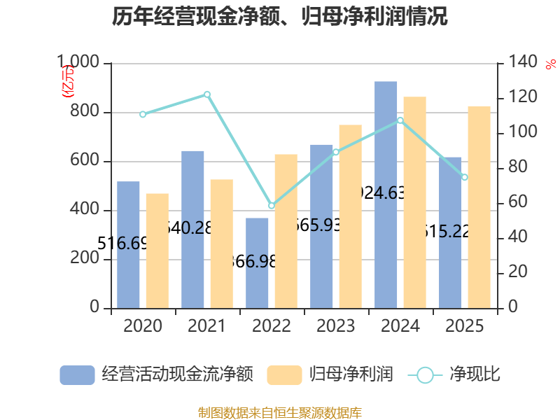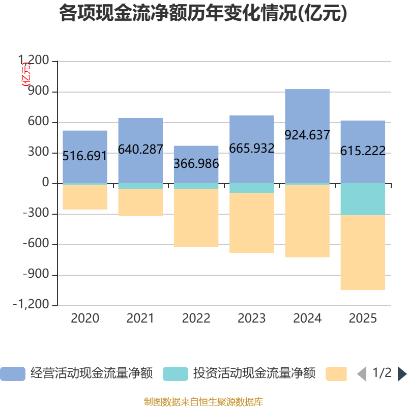 截至2025年,公司经营活动现金流净额为615.22亿元,同比下降33.46%;筹资活动现金流净额-734.27亿元,同比减少23.6亿元;投资活动现金流净额-316.42亿元,上年同期为-17.85亿元。