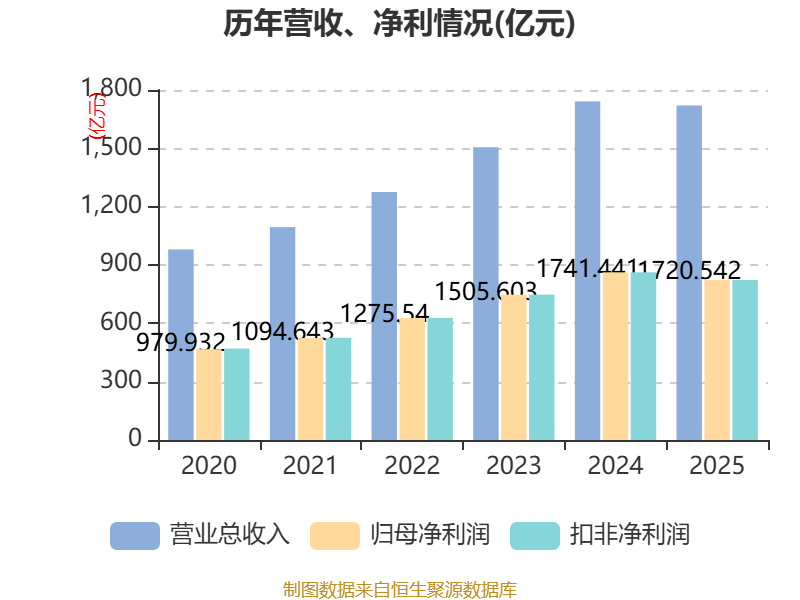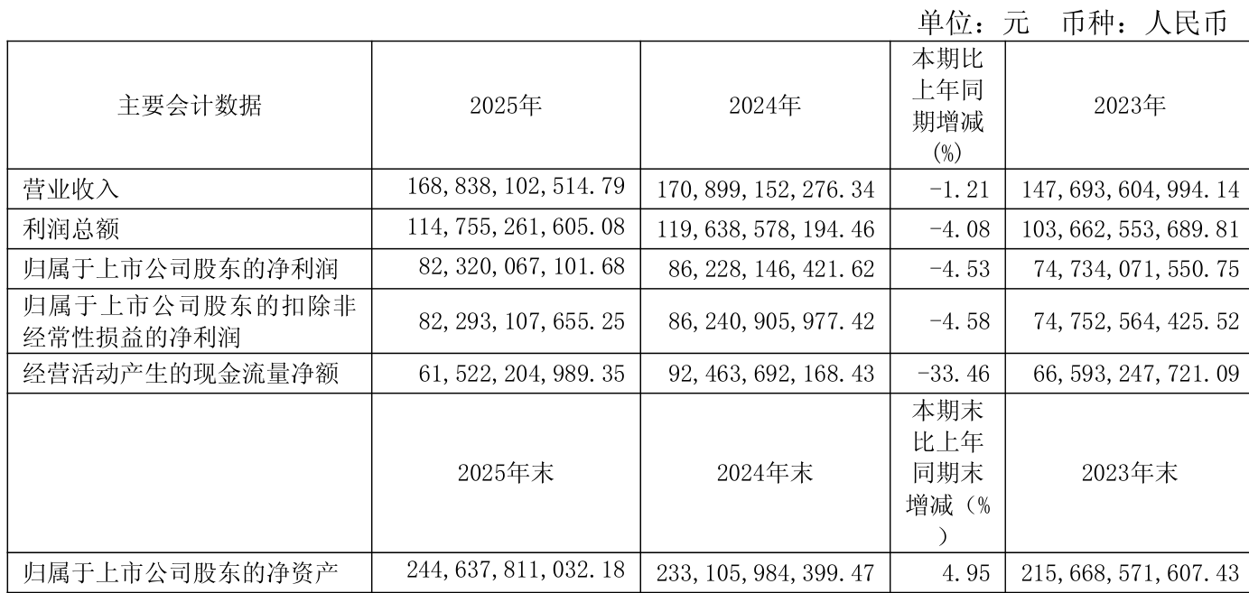 中证智能财讯贵州茅台(600519)4月17日披露2025年年度报告。2025年,公司实现营业总收入1720.54亿元,同比下降1.20%;归母净利润823.2亿元,同比下降4.53%;扣非净利润822.93亿元,同比下降4.58%;经营活动产生的现金流量净额为615.22亿元,同比下降33.46%;报告期内,贵州茅台基本每股收益为65.66元,加权平均净资产收益率为32.53%。公司2025年度分配预案为:拟向全体股东每10股派现279.93元(含税)。