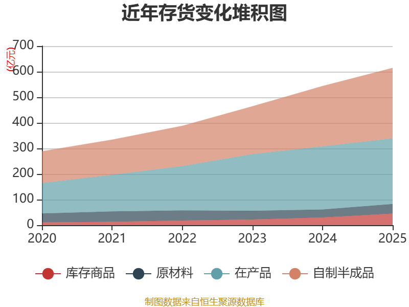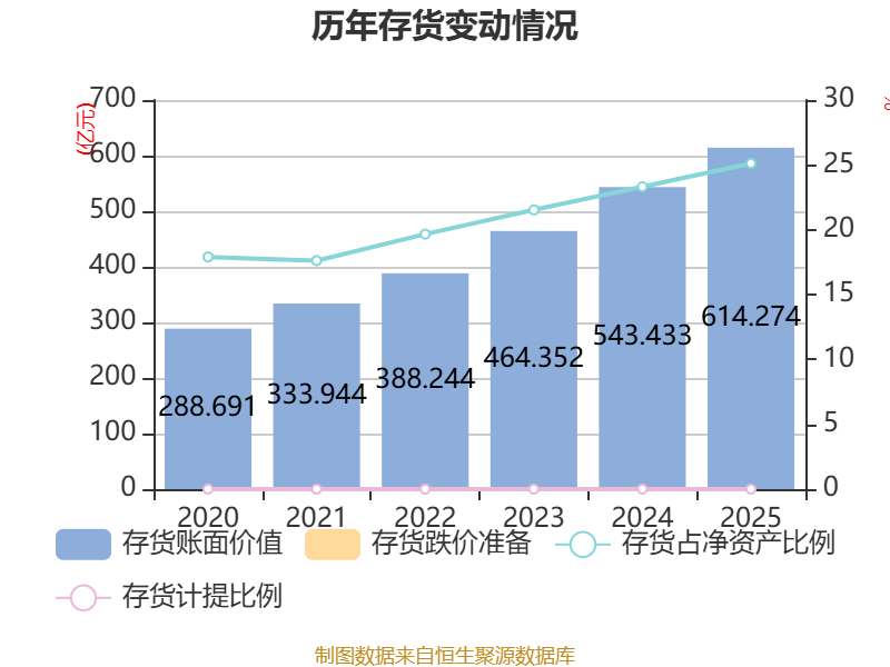 从存货变动来看,截至2025年末,公司存货账面价值为614.27亿元,占净资产的25.11%,较上年末增加70.84亿元。其中,存货跌价准备为128.4万元,计提比例为0%。
