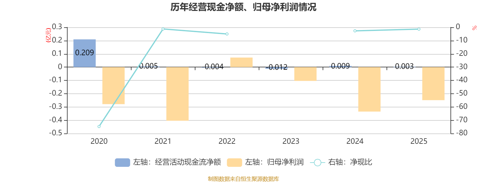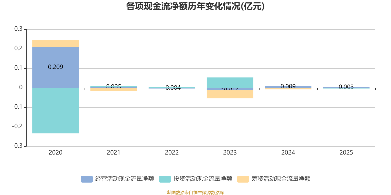 2025年,公司经营活动现金流净额为34.5万元,同比下降61.28%;筹资活动现金流净额12万元,同比增加76.5万元;投资活动现金流净额-37.4万元,上年同期为-23.1万元。