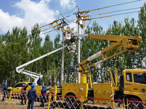 图为国网康平县供电公司配电作业班在10千伏所方线风电支线开展带电消缺作业