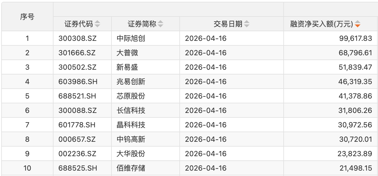 个股方面,48只股获融资净买入额超1亿元。中际旭创获融资净买入额居首,净买入9.96亿元;融资净买入金额居前的还有大普微、新易盛、兆易创新、芯原股份、长信科技、晶科科技、中钨高新、大华股份、佰维存储等。