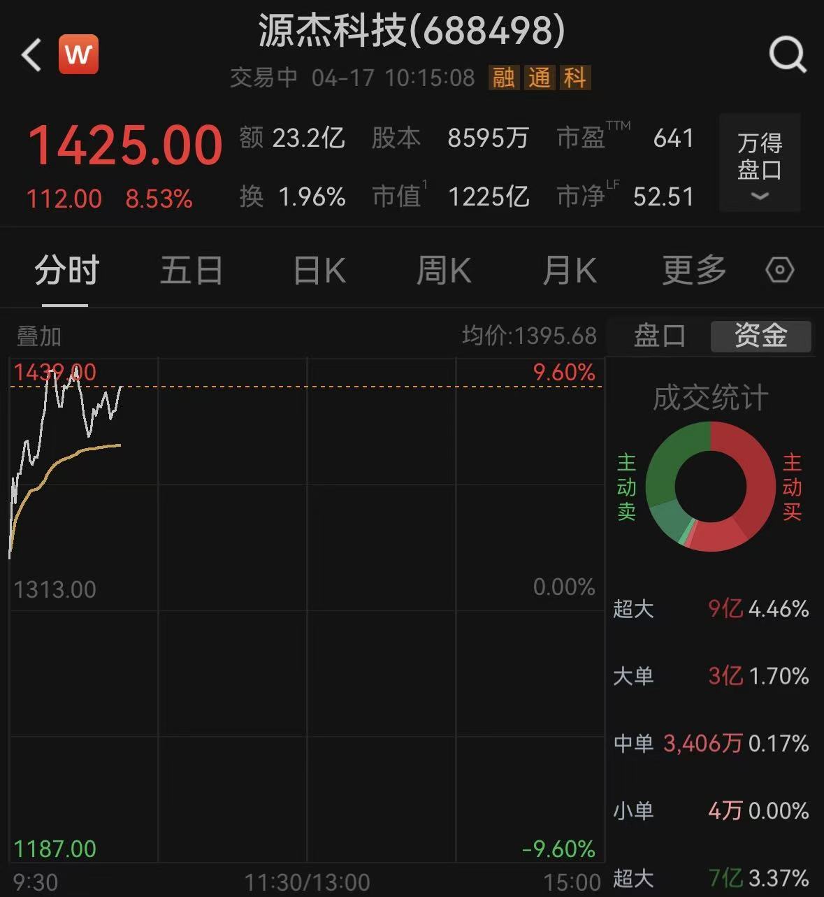 中新网4月17日电(记者谢艺观)4月17日,源杰科技持续走强,盘中股价突破1410元,超越贵州茅台成为A股新“股王”。公开资料显示,源杰科技是一家从半导体晶体生长,晶圆工艺,芯片测试与封装全部开发完毕,并形成工业化规模生产的高科技企业。