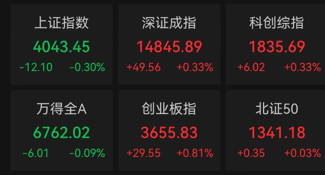 上午收盘,上证指数下跌0.3%,深证成指上涨0.33%,创业板指上涨0.81%,科创综指上涨0.33%。