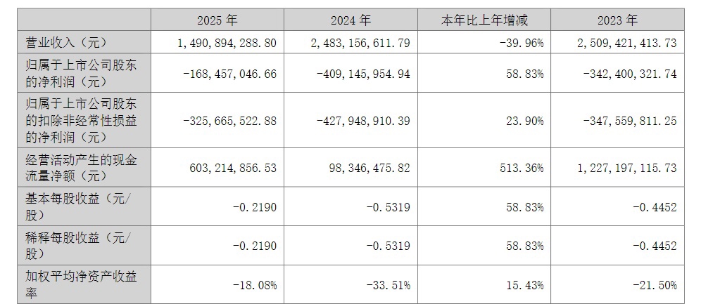 根据新筑股份最新发布的2025年年报来看,公司全年实现营业收入为14.91亿元,同比下降39.96%;归母净利润自去年同期亏损4.09亿元变为亏损1.68亿元,同比减亏58.83%;扣非归母净利润自去年同期亏损4.28亿元变为亏损3.26亿元,同比减亏23.9%。