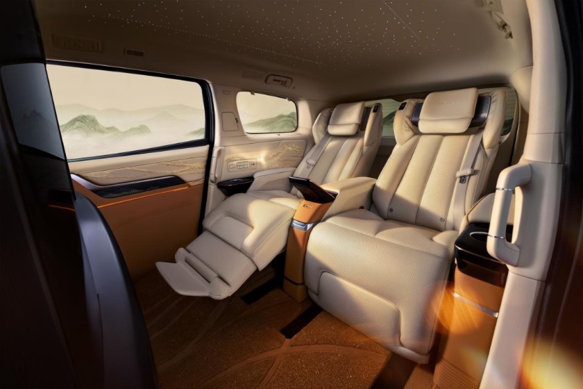 内饰方面,四座版座舱从舒享体验、私密体系到匠艺细节全面升级。行业首创一键礼宾模式,二排座椅在滑移门开合间同步前移至最佳上车位,尽显尊贵礼待。座椅采用12层复合结构,表层为北美小公牛皮Fine Nappa半苯胺顶级真皮,配备22点分区指压按摩和石墨烯远红外理疗功能,打造“理疗级SPA宝座”。私密空间方面,首创府邸级私享座舱隔断体系,搭载32英寸可升降智能屏,可一键切换全封闭私密座舱与通透交互模式,适配商务洽谈与私人休憩。屏幕配备前后舱对讲功能,并搭载全球首款专为后排开发的BOSE悦尊音响系统,营造殿堂级移动音乐厅。