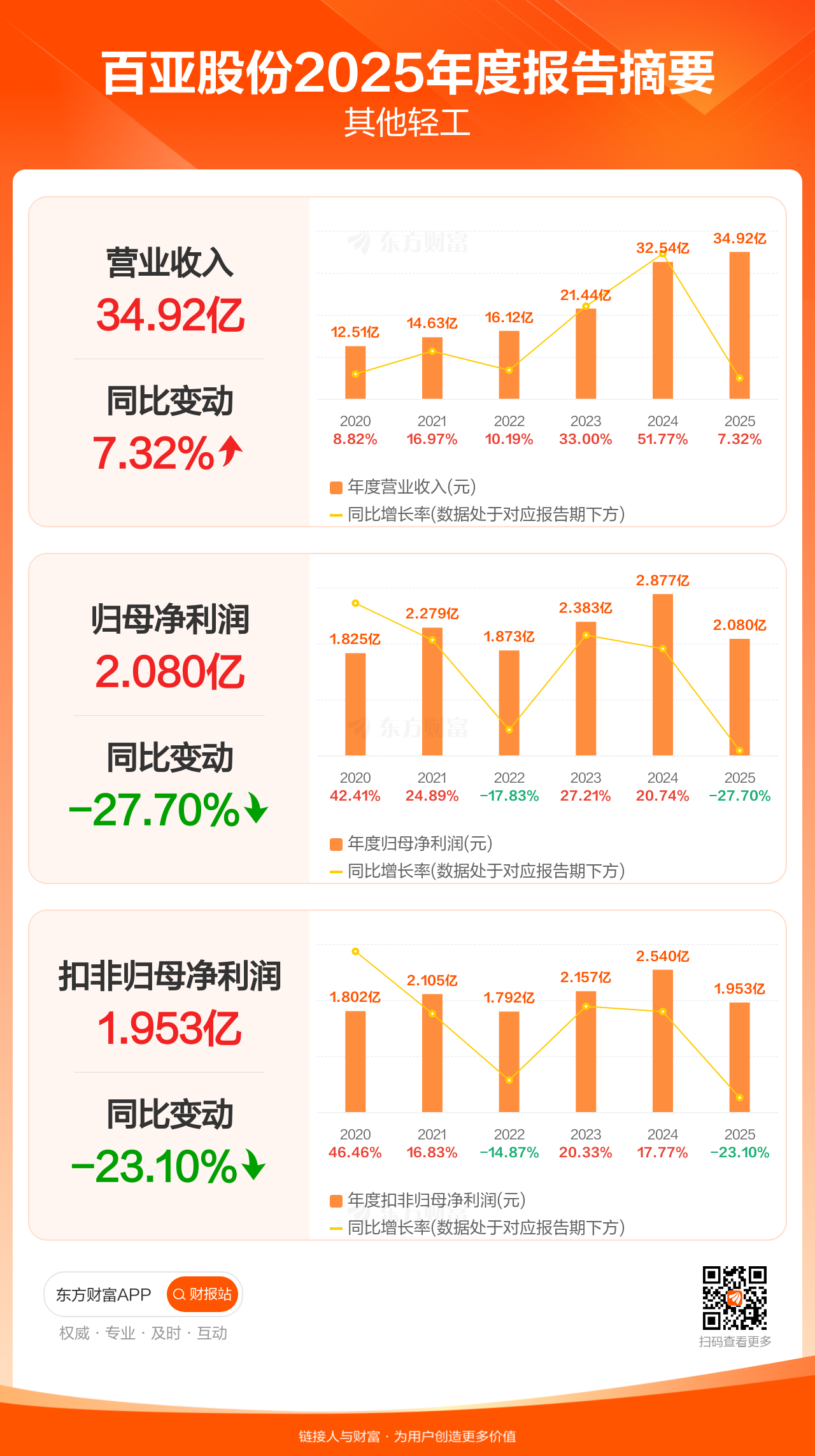 百亚股份4月18日发布2025年年报显示,公司全年实现营业收入34.92亿元,同比增长7.32%;归母净利润2.08亿元,同比下滑27.70%;扣非归母净利润1.95亿元,同比下滑23.10%。