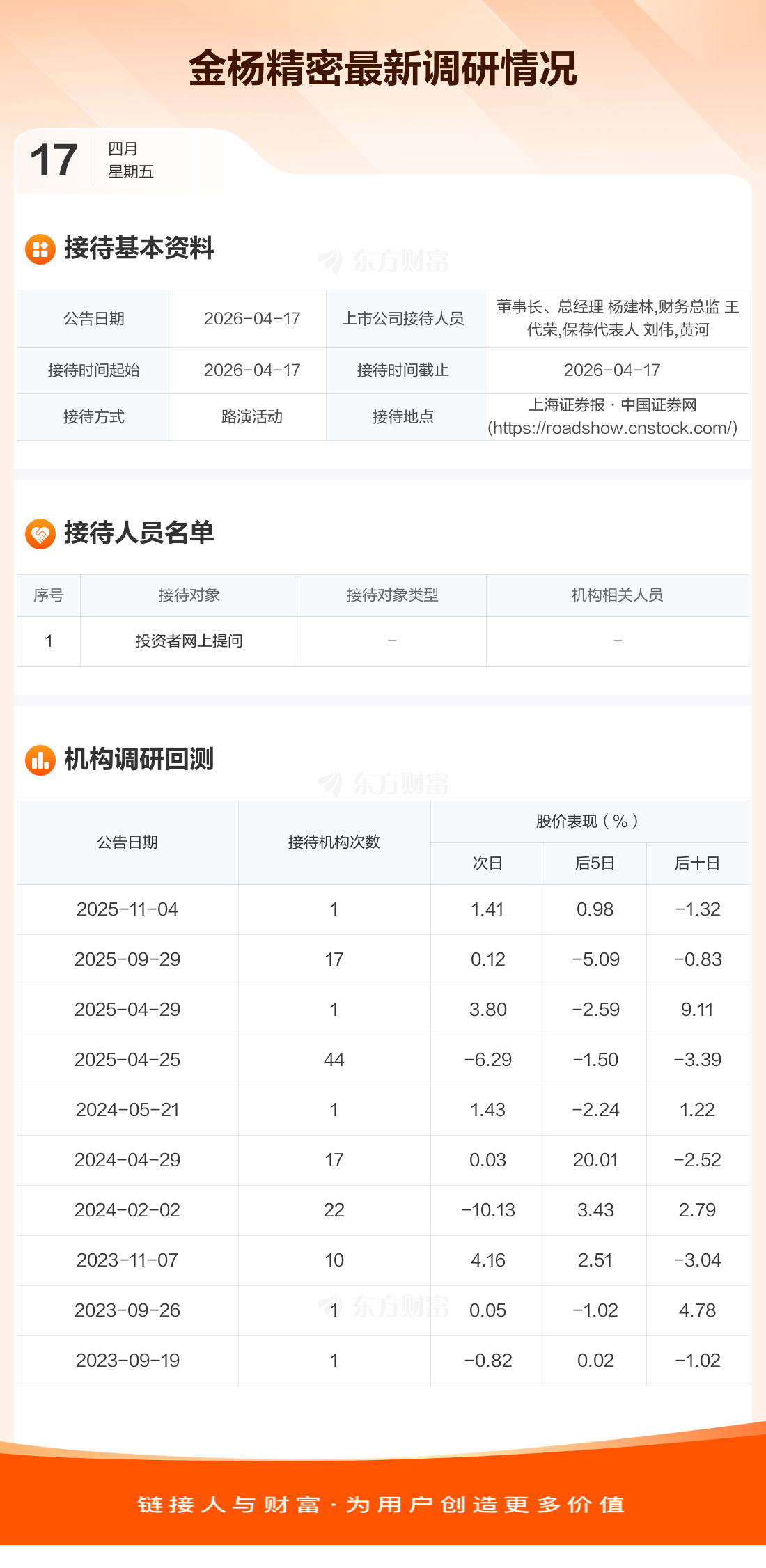 金杨精密4月17日公告称,4月17日接待投资者网上提问调研。接待人员包括董事长、总经理 杨建林,财务总监 王代荣,保荐代表人 刘伟,黄河。