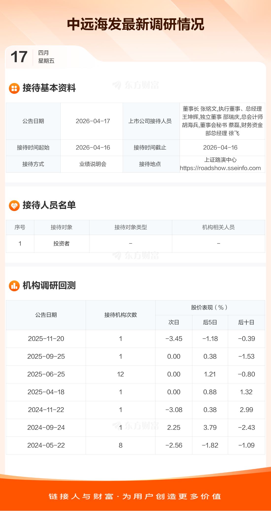 中远海发4月17日公告称,4月16日接待投资者调研。接待人员包括董事长 张铭文,执行董事、总经理 王坤辉,独立董事 邵瑞庆,总会计师 胡海兵,董事会秘书 蔡磊,财务资金部总经理 徐飞。