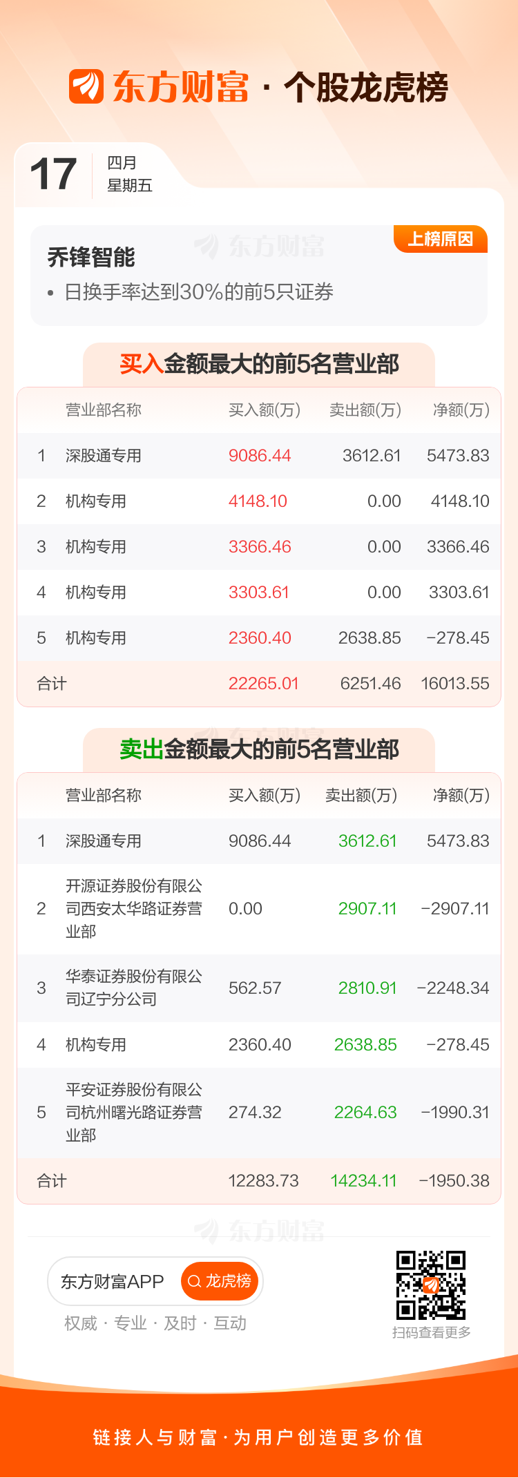 交易所2026年4月17日公布的交易公开信息显示,乔锋智能因成为日换手率达到30%的前5只证券上榜。乔锋智能当日收报94.5元,涨跌幅4.52%,偏离值33.26%,换手率33.26%,成交额11.70亿。