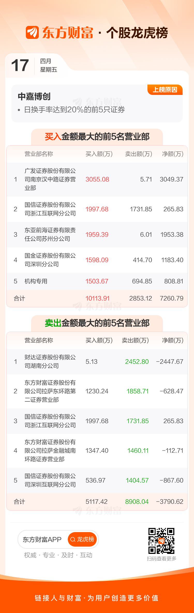 交易所2026年4月17日公布的交易公开信息显示,中嘉博创因成为日换手率达到20%的前5只证券上榜。中嘉博创当日收报5.29元,涨跌幅5.80%,偏离值31.69%,换手率31.69%,成交额14.21亿。
