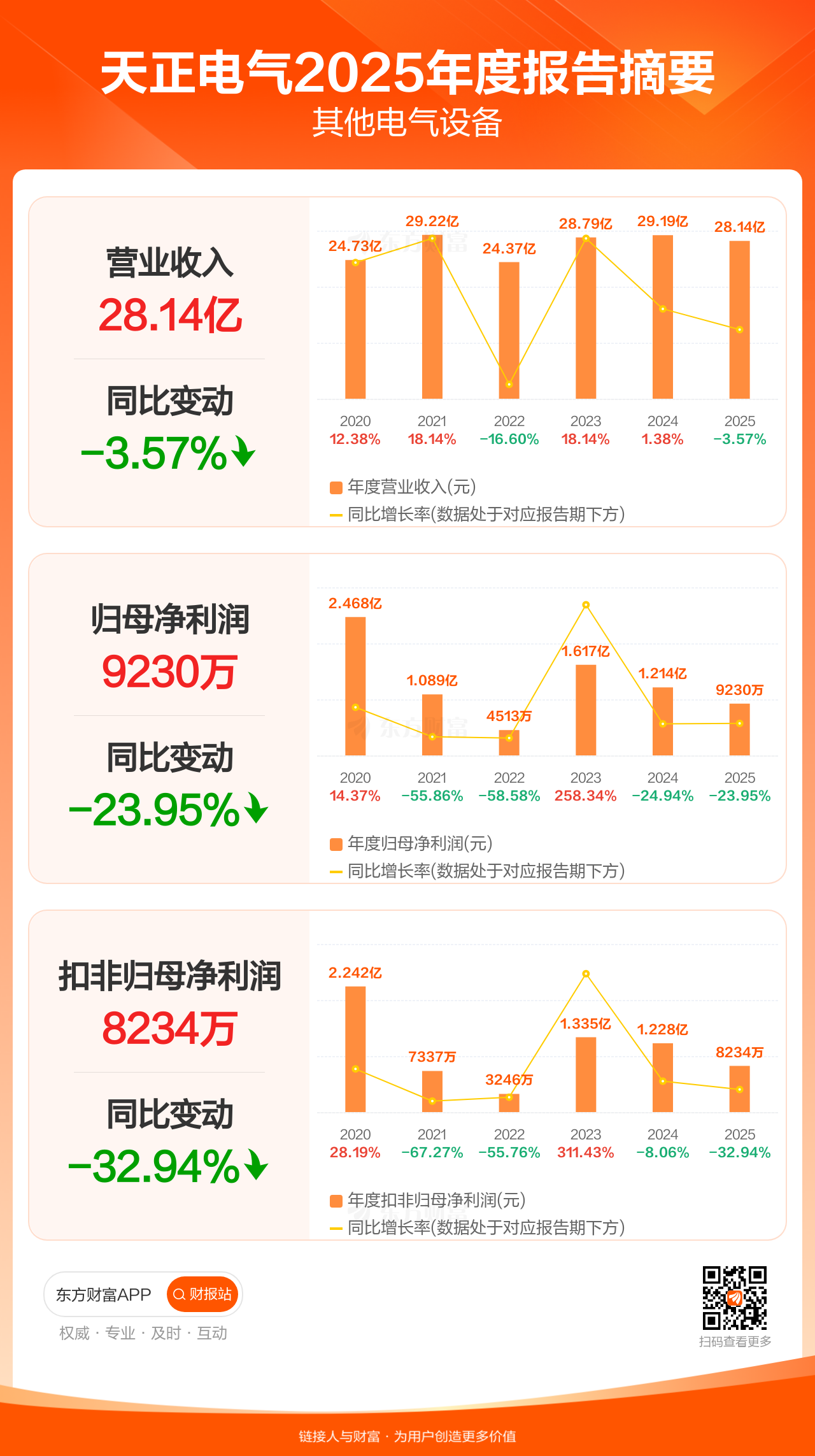 天正电气4月18日发布2025年年报显示,公司全年实现营业收入28.14亿元,同比下滑3.57%;归母净利润9229.94万元,同比下滑23.95%;扣非归母净利润8233.76万元,同比下滑32.94%。