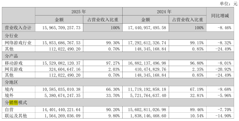从具体产品类型、地区市场和销售模式来看,三七互娱2025财年移动游戏、网络游戏,境外与境内市场,自营产品及联运产品收入均出现一定程度下滑。