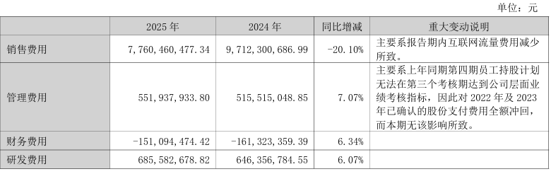 财报数据显示,2025财年三七互娱管理费用、财务费用和研发费用均同比增长,但销售费用大幅降低20.10%,从2024年的97.12亿元下降至2025年的77.60亿元,也是近五年来三七互娱全年销售费用首次低于80亿元。财报解释称,销售费用变动主要系报告期内互联网流量费用减少所致。