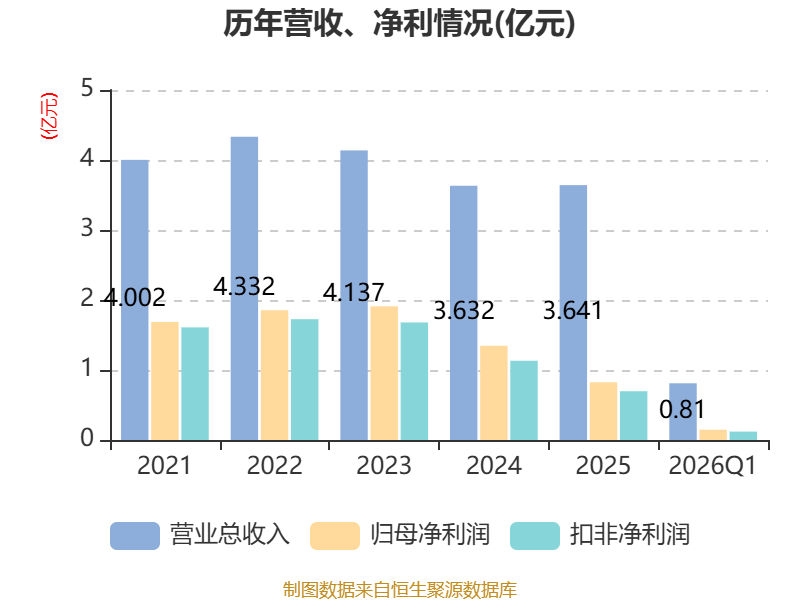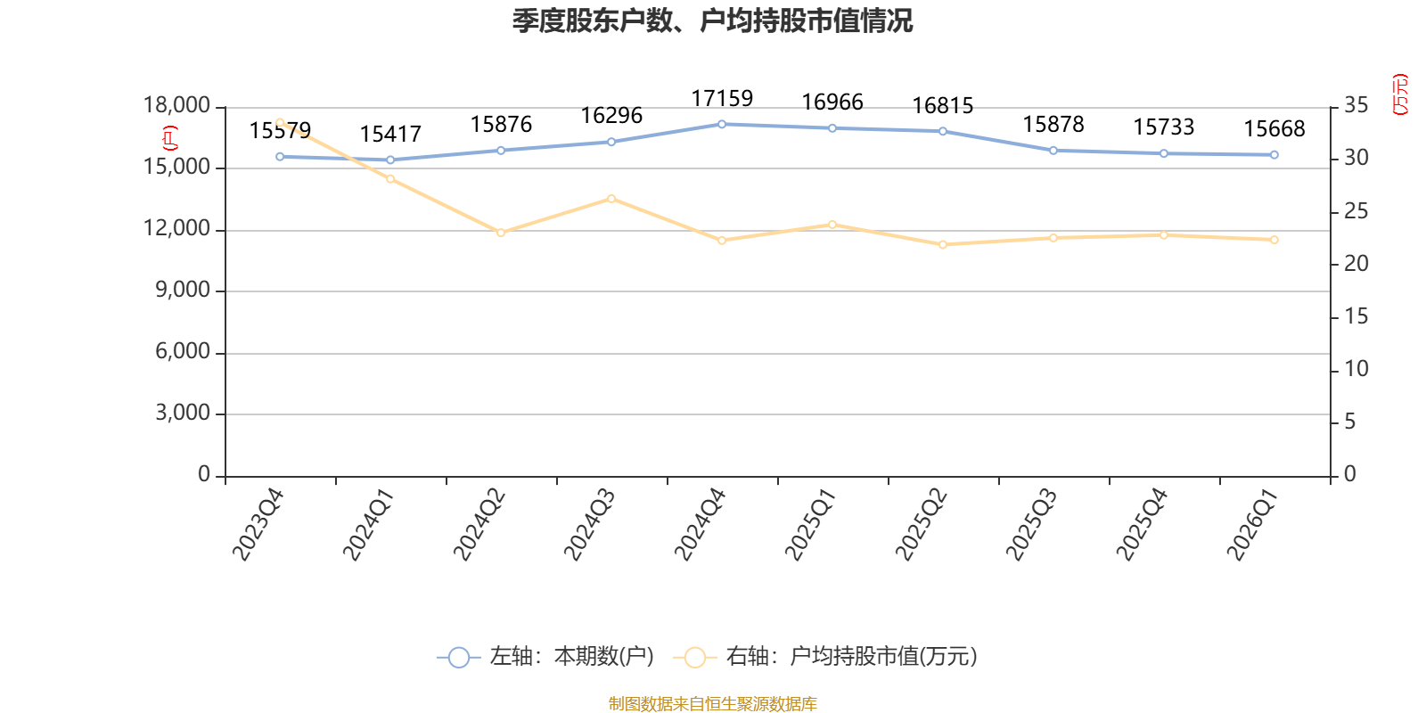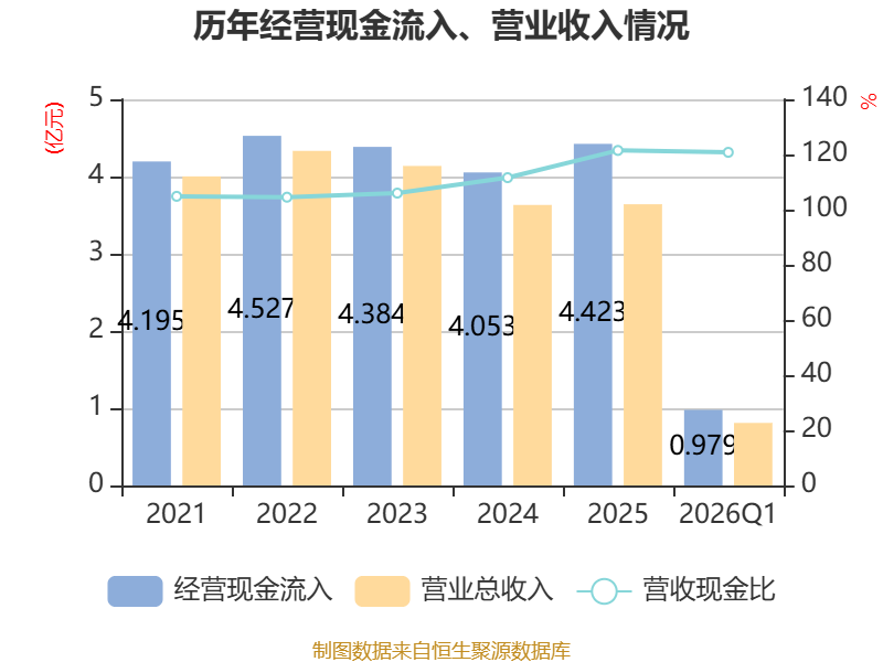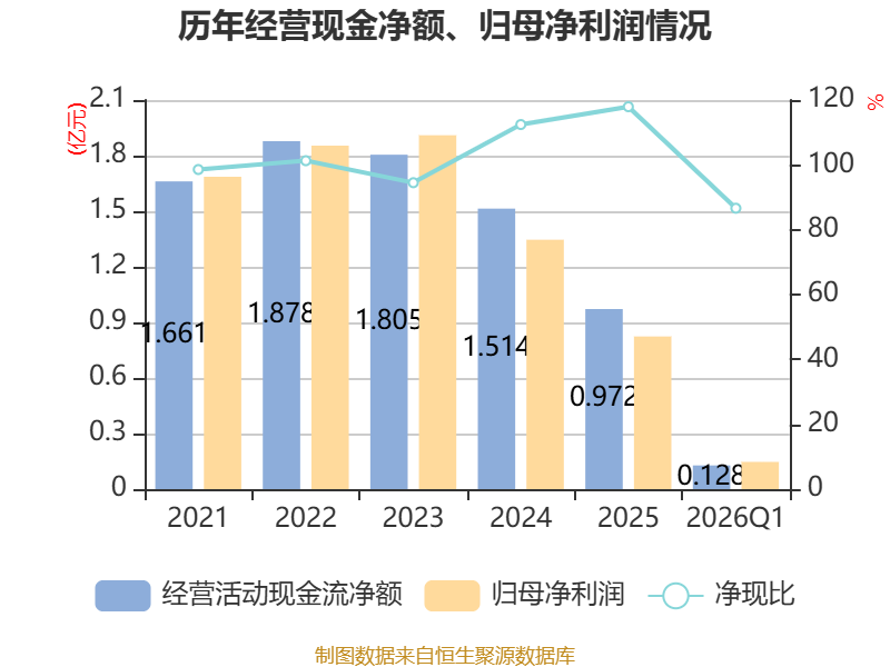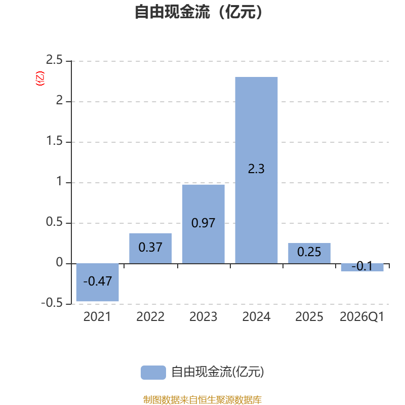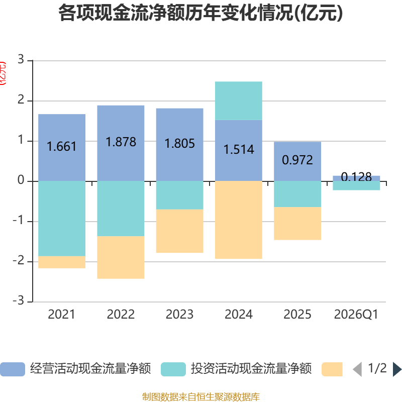 截至2026年一季度末,公司经营活动现金流净额为1277.82万元,同比下降67.19%;筹资活动现金流净额0元,与同期相比基本不变;投资活动现金流净额-2307.74万元,上年同期为-8822.61万元。