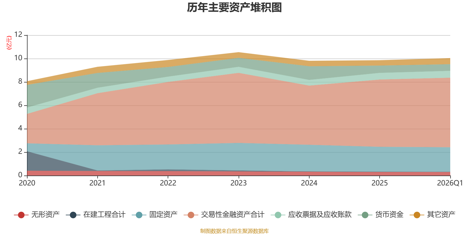 资产重大变化方面,截至2026年一季度末,公司交易性金融资产合计较上年末增加3.32%,占公司总资产比重上升0.84个百分点;固定资产较上年末减少1.99%,占公司总资产比重下降0.82个百分点;货币资金较上年末减少8.4%,占公司总资产比重下降0.63个百分点;其他非流动资产较上年末增加109.6%,占公司总资产比重上升0.57个百分点。