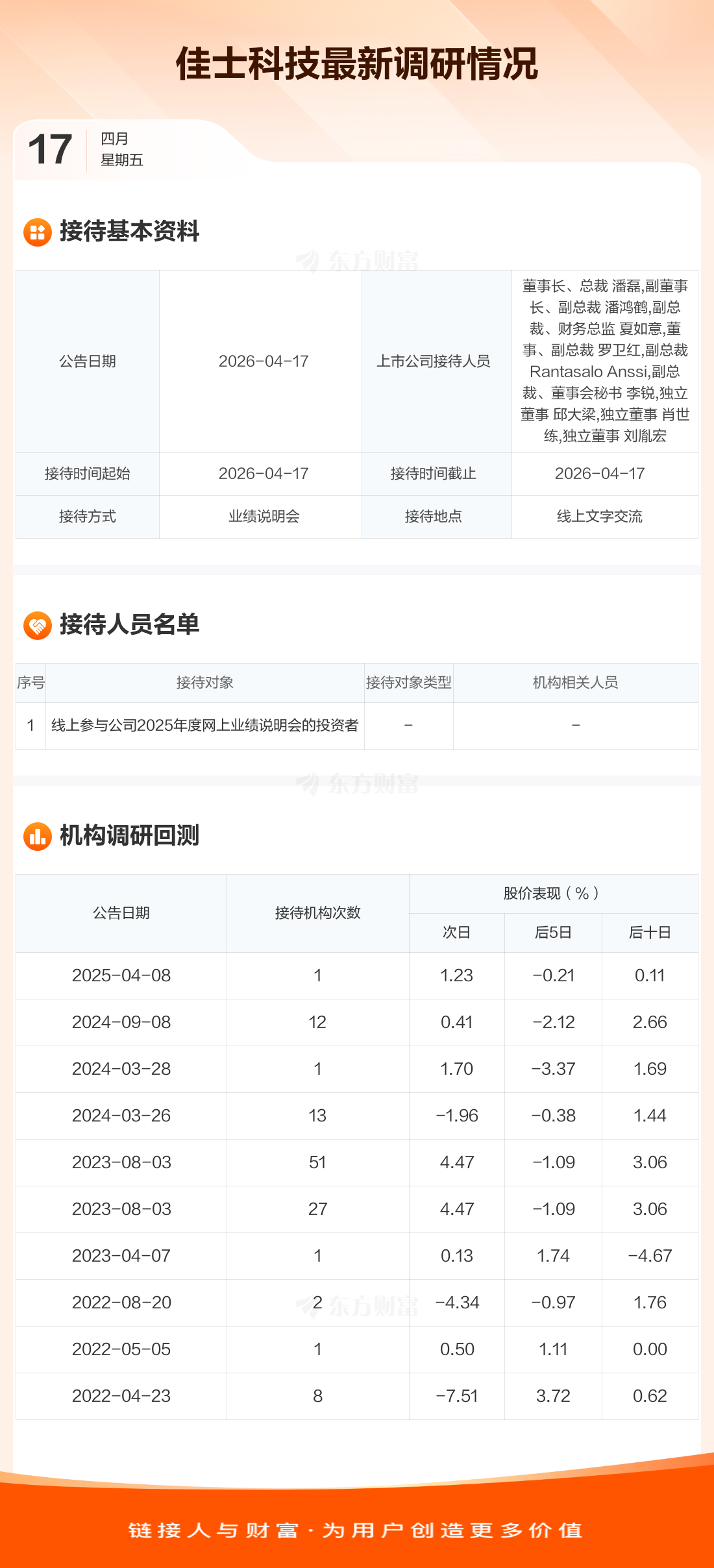 佳士科技4月17日公告称,4月17日接待线上参与公司2025年度网上业绩说明会的投资者调研。接待人员包括董事长、总裁 潘磊,副董事长、副总裁 潘鸿鹤,副总裁、财务总监 夏如意,董事、副总裁 罗卫红,副总裁 Rantasalo Anssi,副总裁、董事会秘书 李锐,独立董事 邱大梁,独立董事 肖世练,独立董事 刘胤宏。