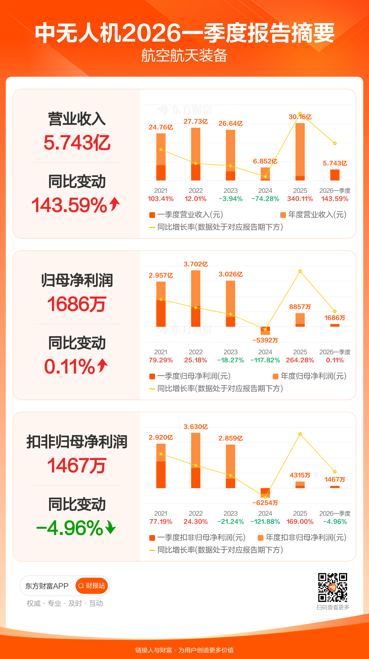 中无人机4月18日发布2026年一季报显示,公司一季度实现营业收入5.74亿元,同比增长143.59%;归母净利润1686.45万元,同比增长0.11%;扣非归母净利润1467.27万元,同比下滑4.96%。