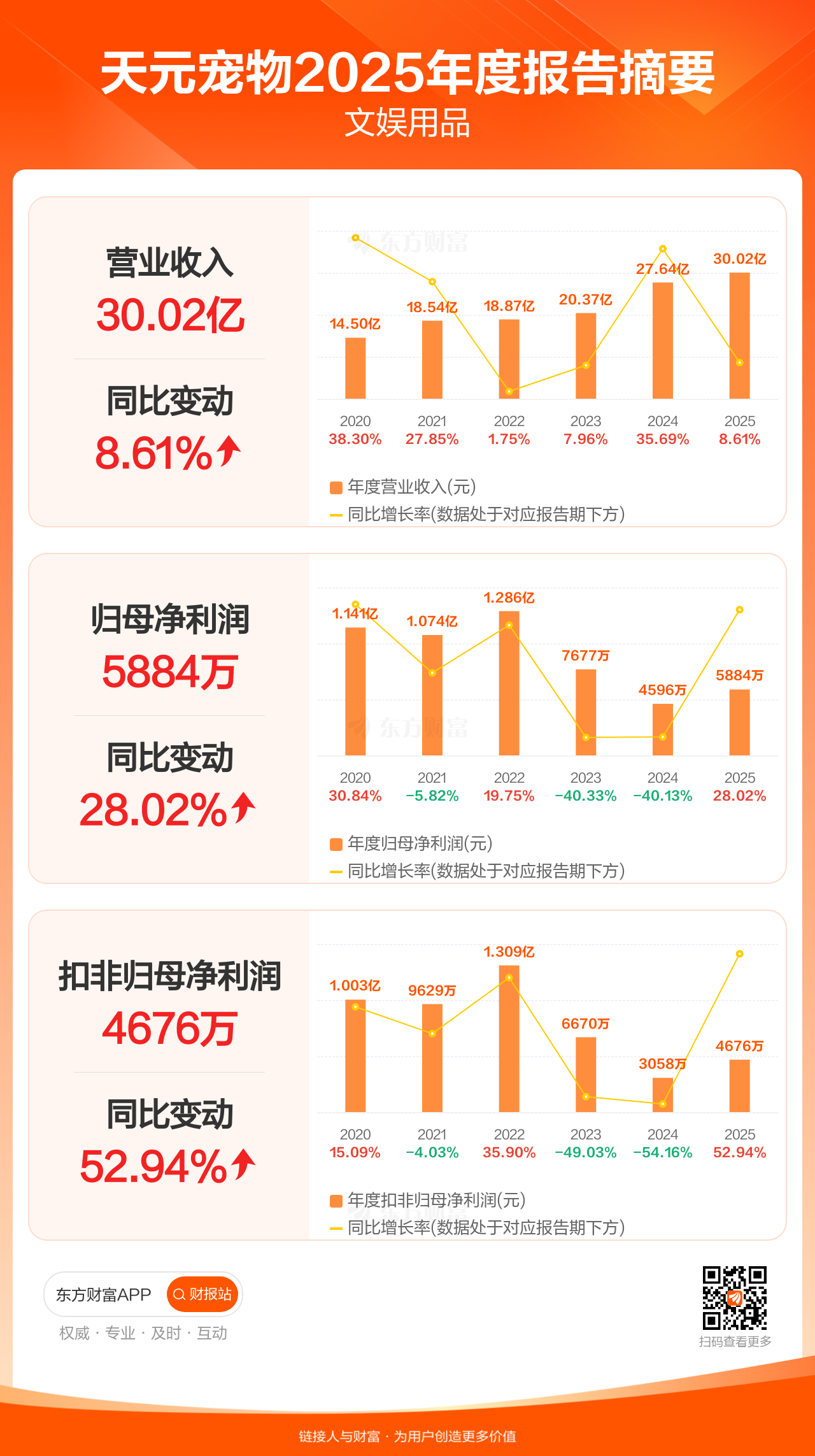 天元宠物4月18日发布2025年年报显示,公司全年实现营业收入30.02亿元,同比增长8.61%;归母净利润5883.98万元,同比增长28.02%;扣非归母净利润4676.27万元,同比增长52.94%。