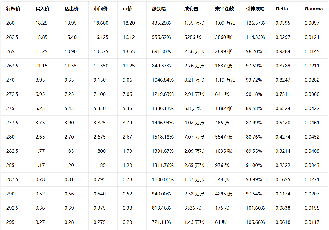 观察4月17日到期的看涨期权,成交量最高为行权价为280美元的看涨期权,涨幅为1518%。