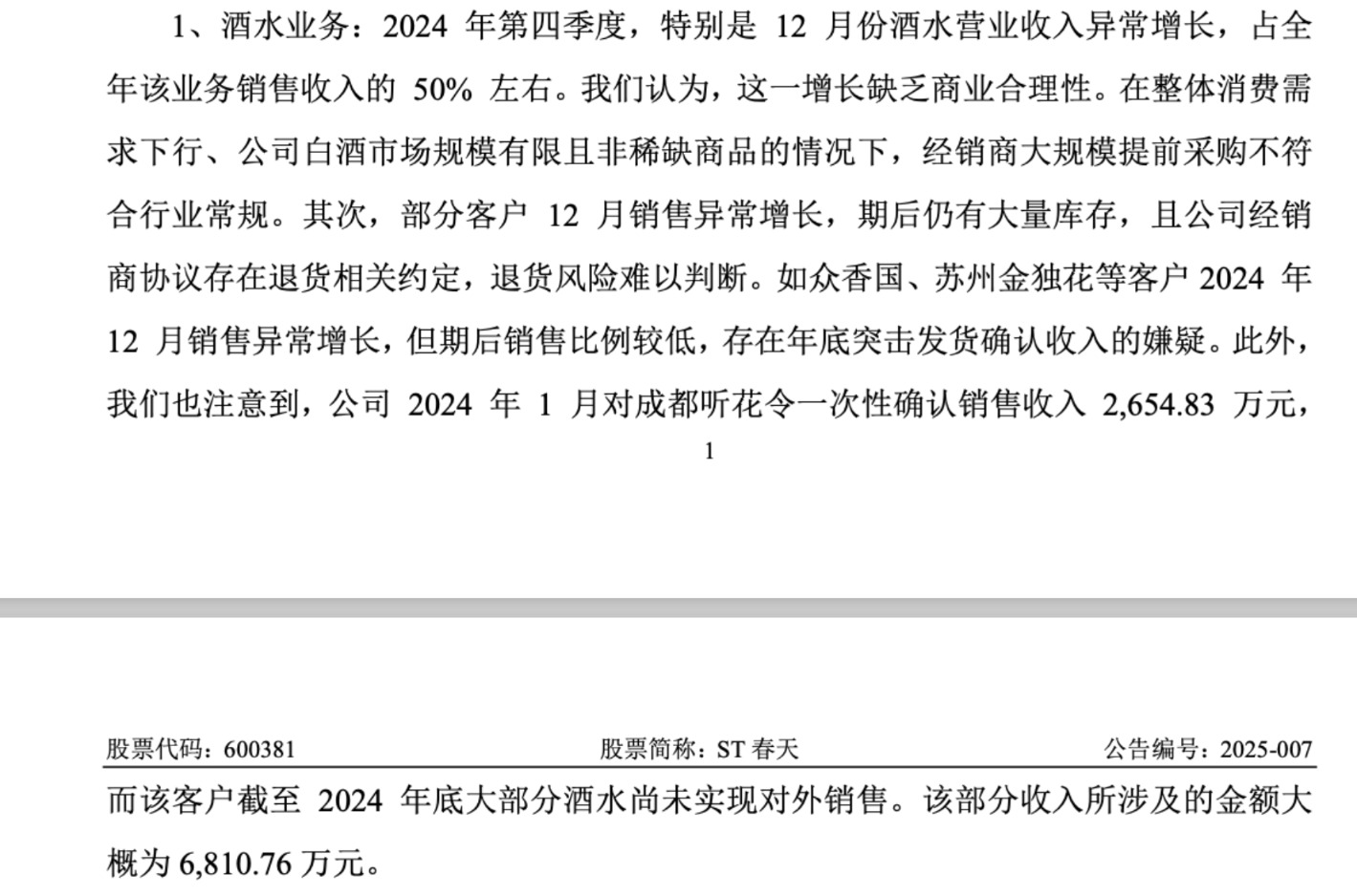 更值得关注的是该公司的营收数据。2025年1月,*ST春天发布业绩预告称,2024年营收预计为3.11亿至3.39亿元,四季度同比增幅超过100%。但年审机构政旦志远会计师事务所在审计过程中发现,部分客户2024年12月酒水销售异常增长,期后库存较大、退货风险难以判断,酒水业务约6811万元收入不符合确认条件。