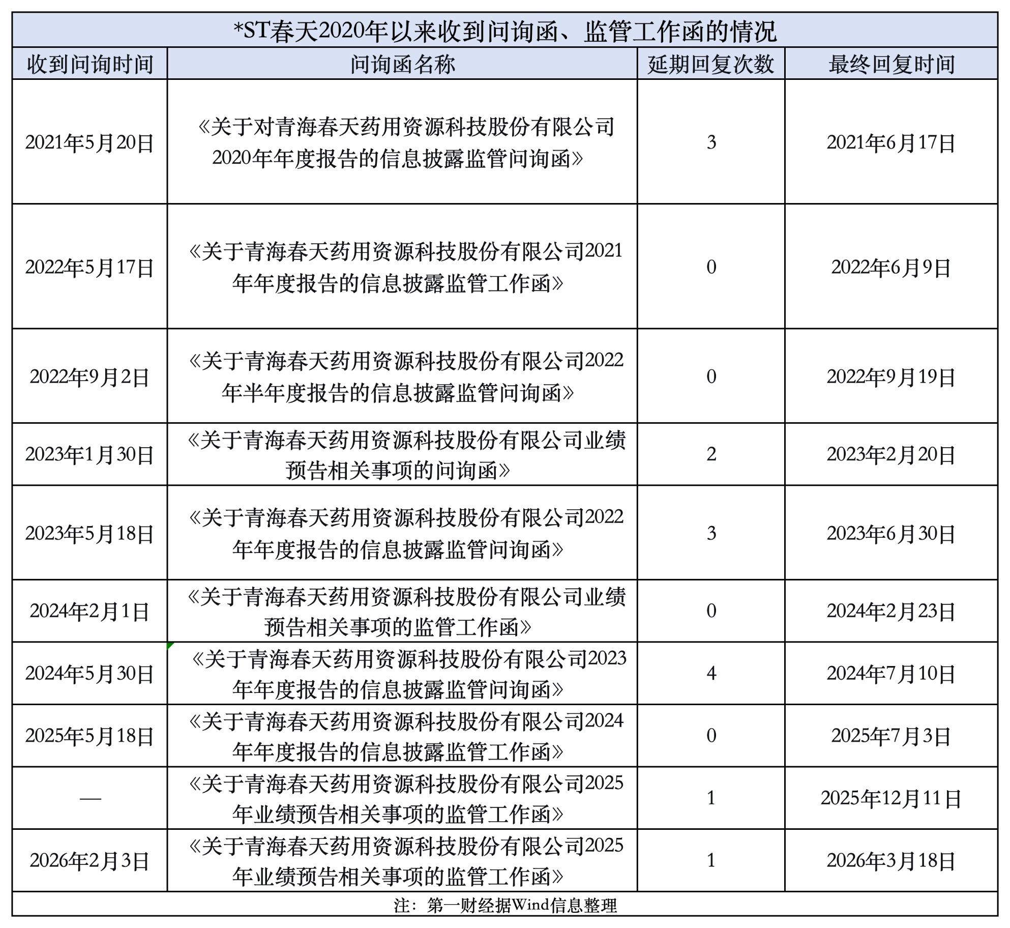 Wind显示,自2020年起*ST春天共收到过10张针对其业绩报告或预告的问询函,但面对监管的关注,*ST春天不仅反复拖延才能给出答复,而且其与宜宾听花酒业发展有限责任公司(以下简称“宜宾听花”)之间的预付款问题,在遭监管连续4年追问后仍没有说实话。