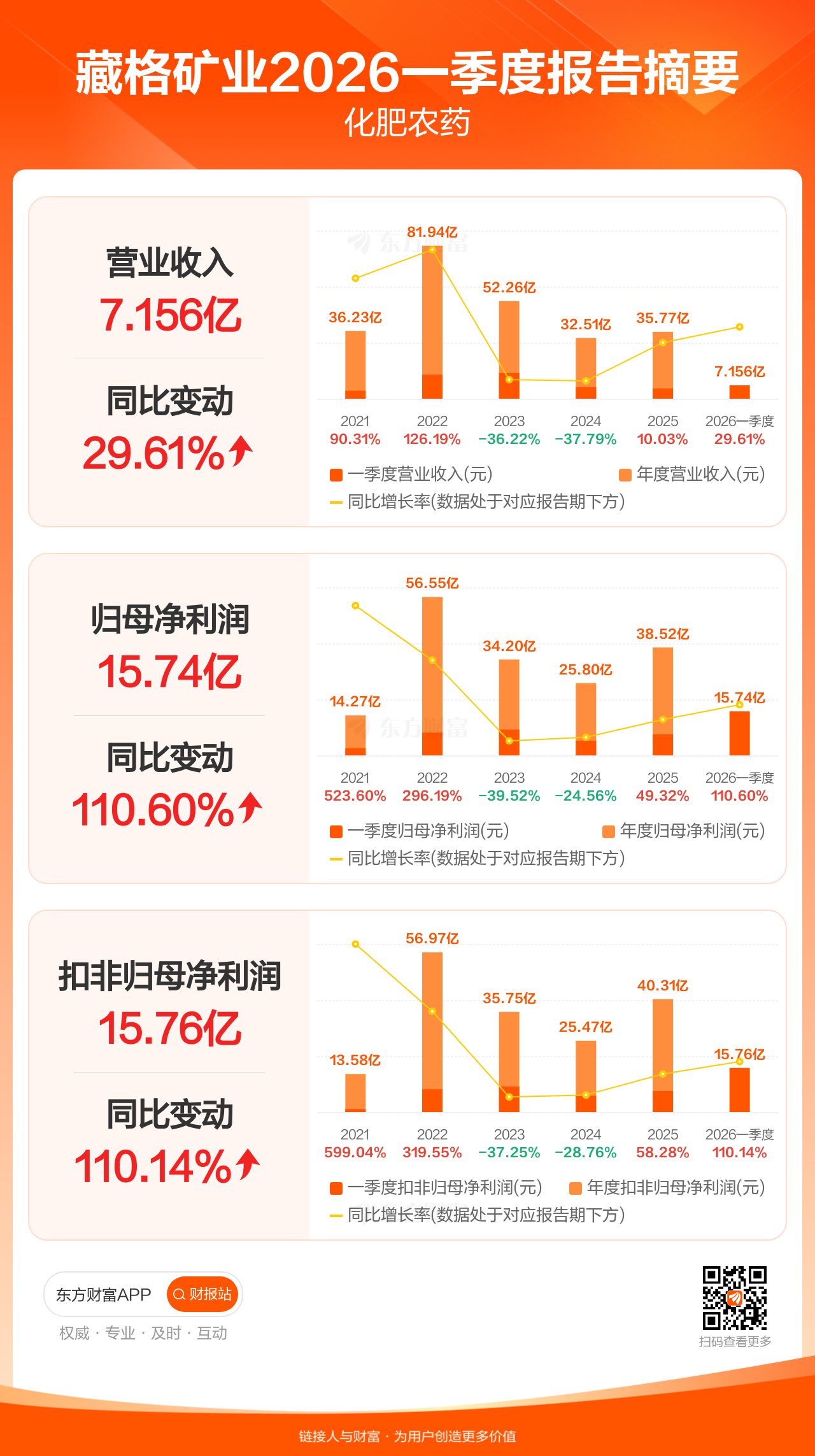 藏格矿业4月18日发布2026年一季报显示,公司一季度实现营业收入7.16亿元,同比增长29.61%;归母净利润15.74亿元,同比增长110.60%;扣非归母净利润15.76亿元,同比增长110.14%。