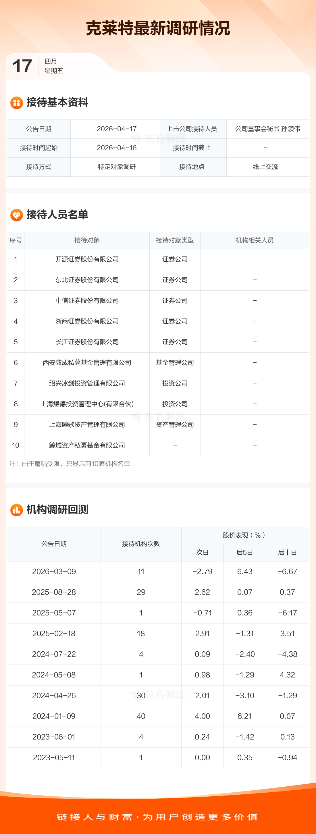 克莱特4月17日公告称,4月16日接待开源证券股份有限公司等22家机构调研。接待人员包括公司董事会秘书 孙领伟。