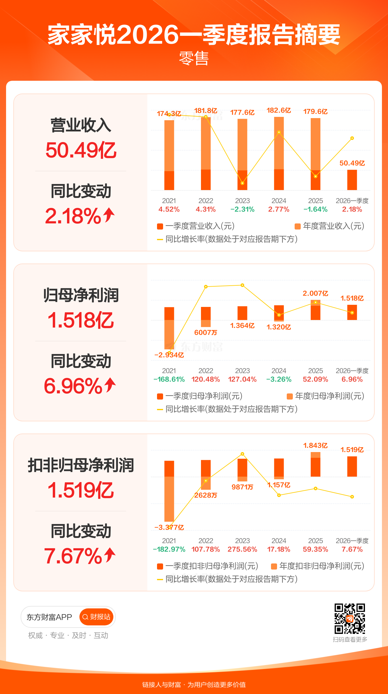 家家悦4月18日发布2026年一季报显示,公司一季度实现营业收入50.49亿元,同比增长2.18%;归母净利润1.52亿元,同比增长6.96%;扣非归母净利润1.52亿元,同比增长7.67%。