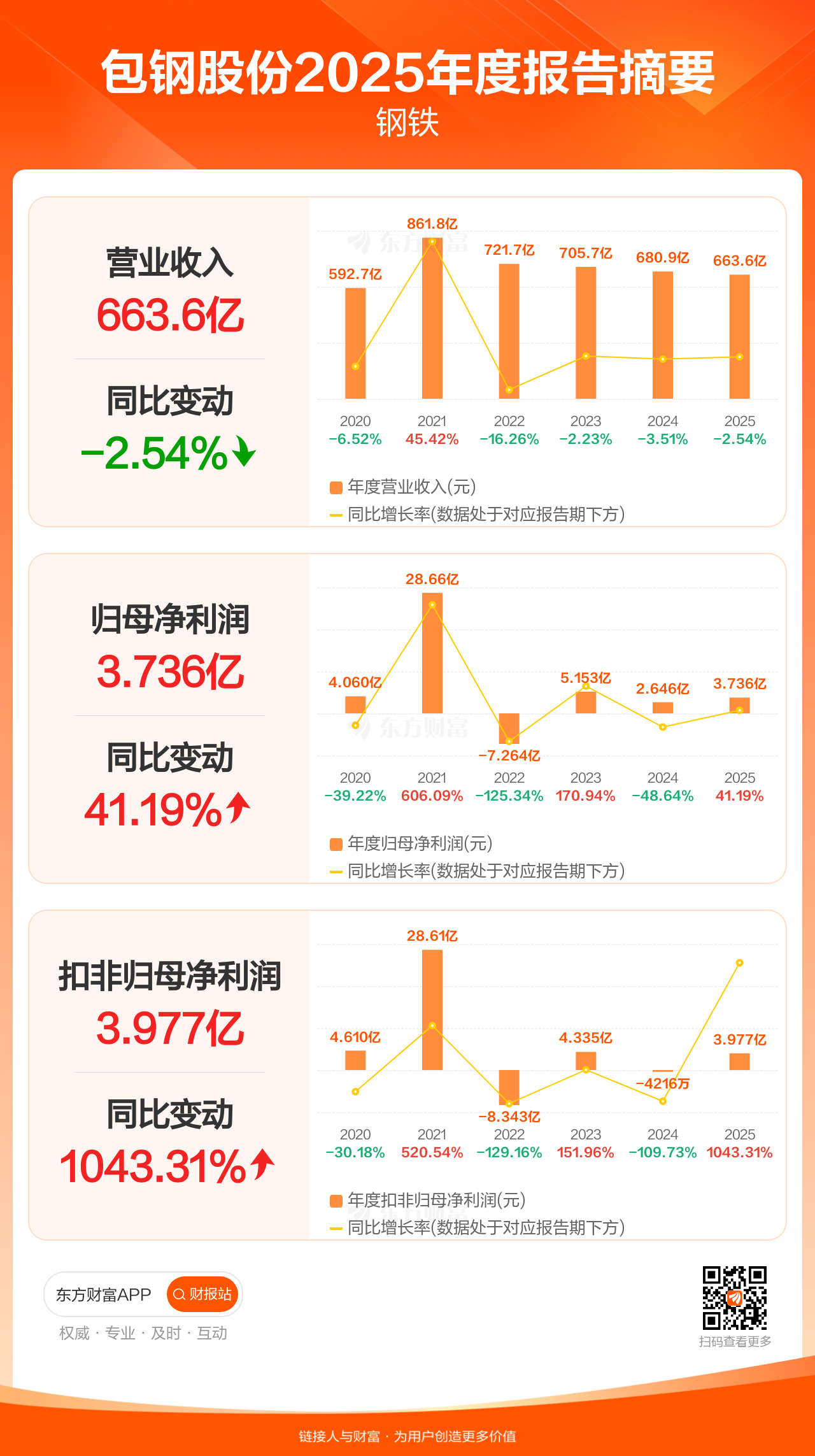 包钢股份4月18日发布2025年年报显示,公司全年实现营业收入663.58亿元,同比下滑2.54%;归母净利润3.74亿元,同比增长41.19%;扣非归母净利润3.98亿元,同比增长1043.31%。