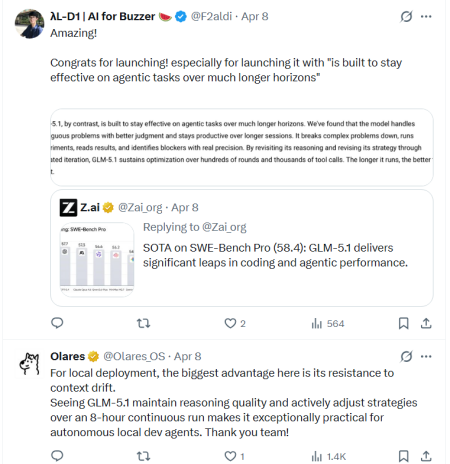 而在海外网友“Olares_OS ”看来,对于本地部署场景,GLM-5.1最大的优势是抗上下文漂移能力,“看到 GLM-5.1 在连续 8 小时的运行中依然保持推理质量,并主动调整策略,这让它在本地自动化开发智能体场景中具备极高的实用性。感谢团队!”