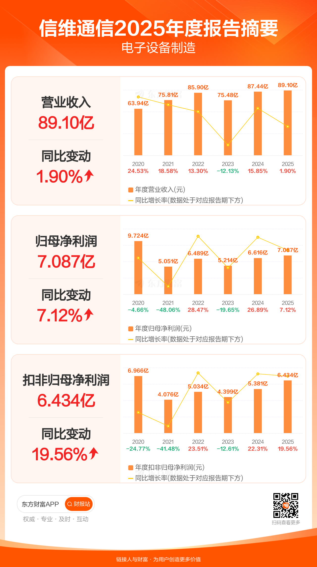 信维通信4月18日发布2025年年报显示,公司全年实现营业收入89.10亿元,同比增长1.90%;归母净利润7.09亿元,同比增长7.12%;扣非归母净利润6.43亿元,同比增长19.56%。