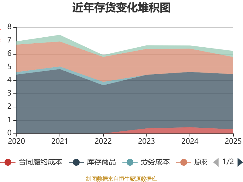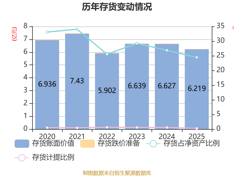 从存货变动来看,截至2025年末,公司存货账面价值为6.22亿元,占净资产的24.43%,较上年末减少4078.34万元。其中,存货跌价准备为139.44万元,计提比例为0.22%。