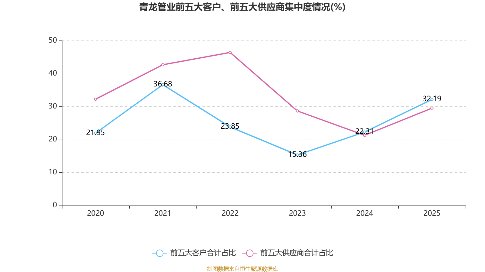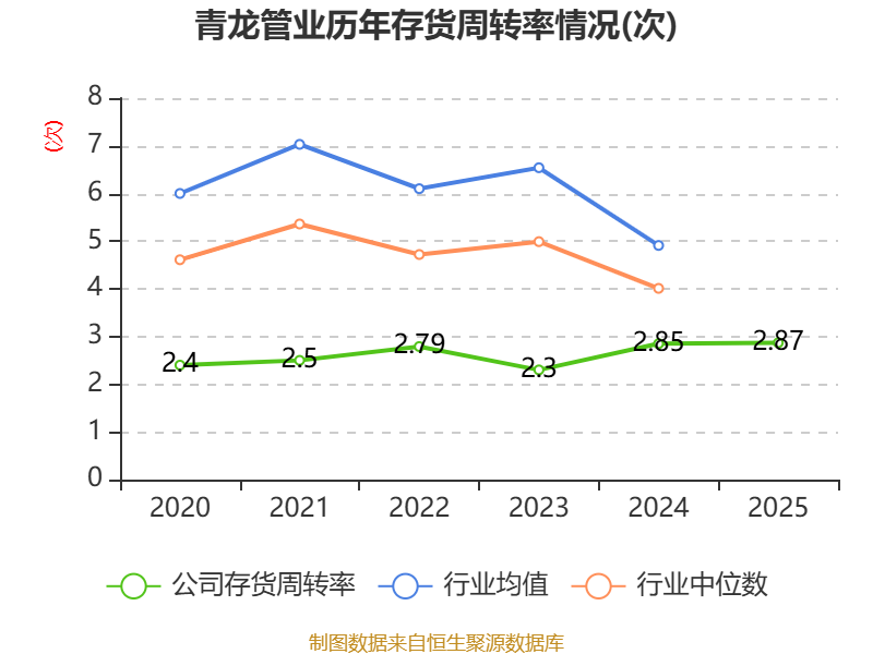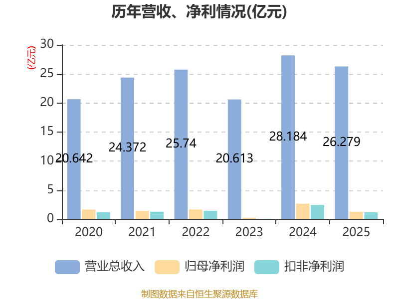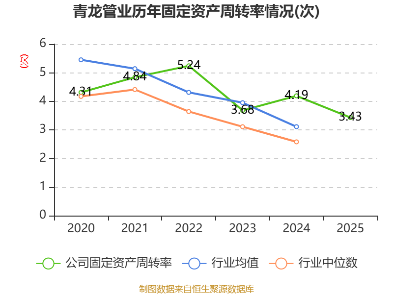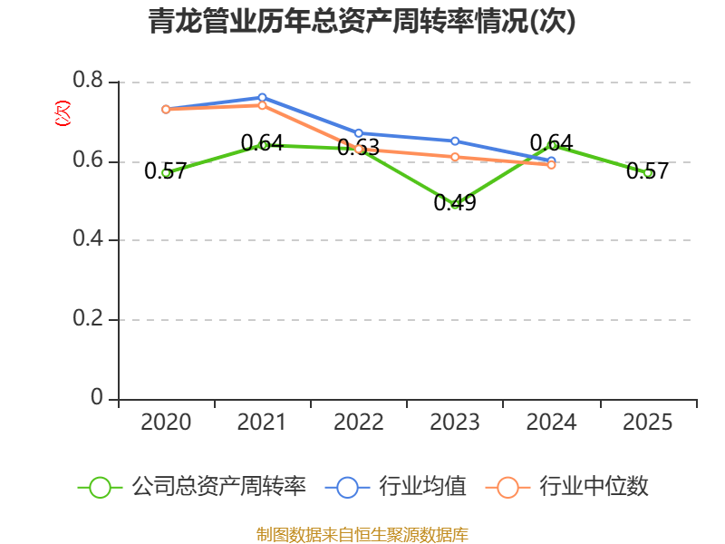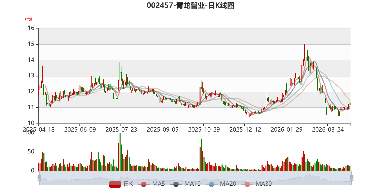 中证智能财讯青龙管业(002457)4月18日披露2025年年度报告。2025年,公司实现营业总收入26.28亿元,同比下降6.76%;归母净利润1.3亿元,同比下降51.58%;扣非净利润1.2亿元,同比下降51.25%;经营活动产生的现金流量净额为5.65亿元,同比增长346.72%;报告期内,青龙管业基本每股收益为0.39元,加权平均净资产收益率为5.16%。公司2025年度分配预案为:拟向全体股东每10股派现1.2元(含税)。