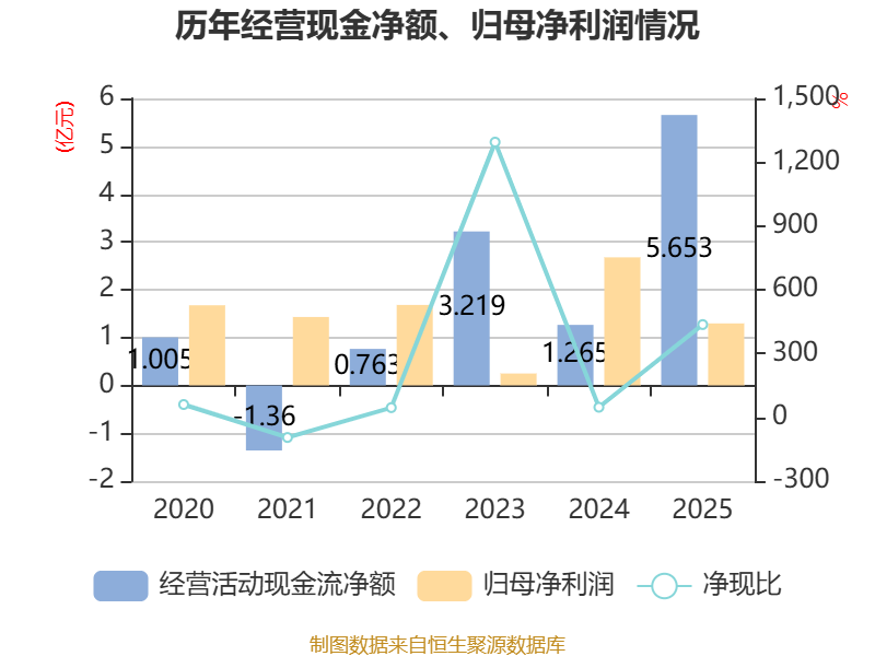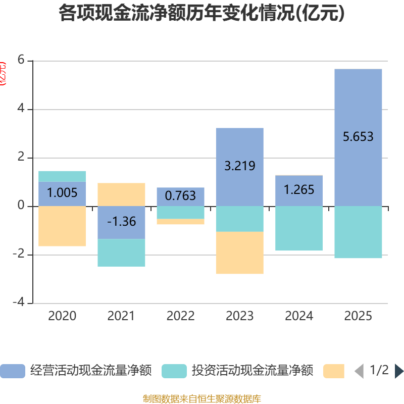 截至2025年,公司经营活动现金流净额为5.65亿元,同比增长346.72%;筹资活动现金流净额37.22万元,同比减少106.84万元;投资活动现金流净额-2.15亿元,上年同期为-1.84亿元。