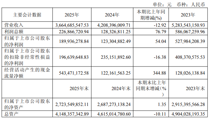 4月17日晚间,“数字营销第一股”三人行(605168)披露2025年年报,公司营业收入为36.65亿元,同比下降12.92%;归母净利润为1.90亿元,同比增长54.04%;扣非归母净利润为1.97亿元,同比下降16.38%;经营现金流净额为5.43亿元,同比飙升344.88%。