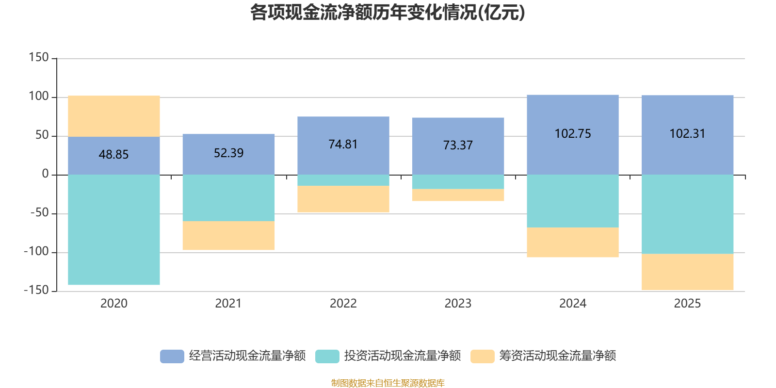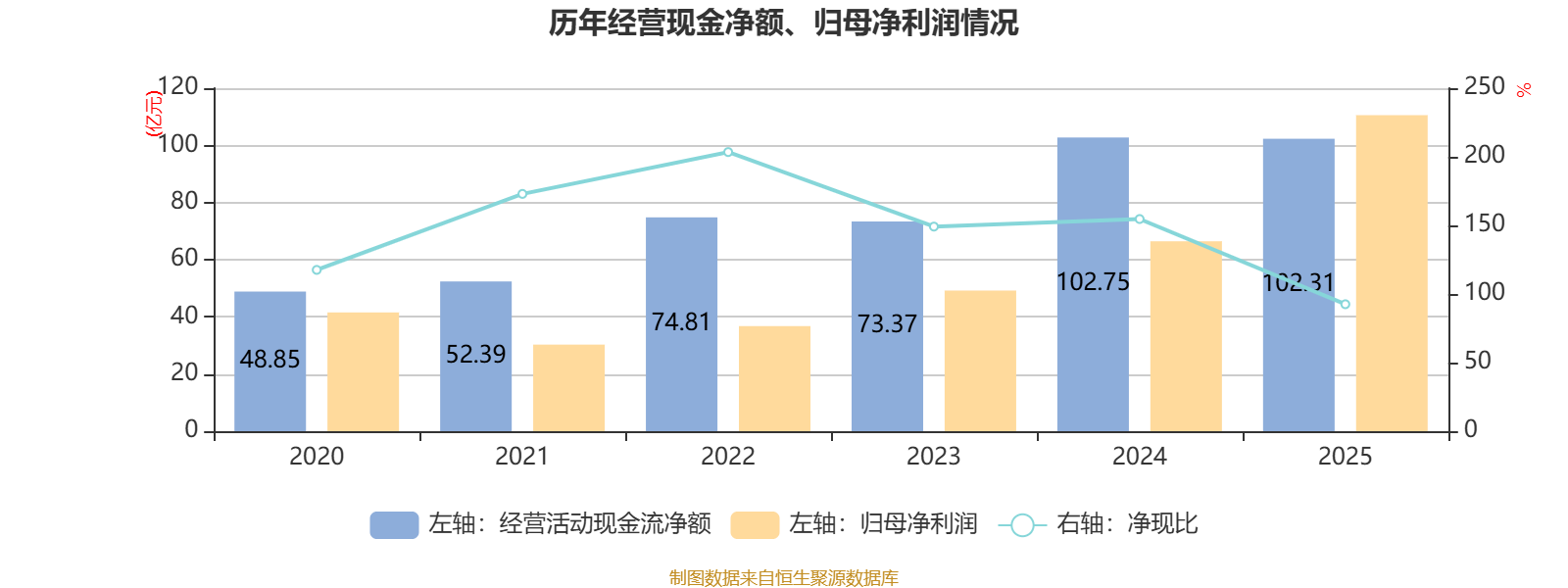 2025年,公司经营活动现金流净额为102.31亿元,同比增长312.54%;筹资活动现金流净额-46.49亿元,同比减少38.34亿元;投资活动现金流净额-102.27亿元,上年同期为13.24亿元。