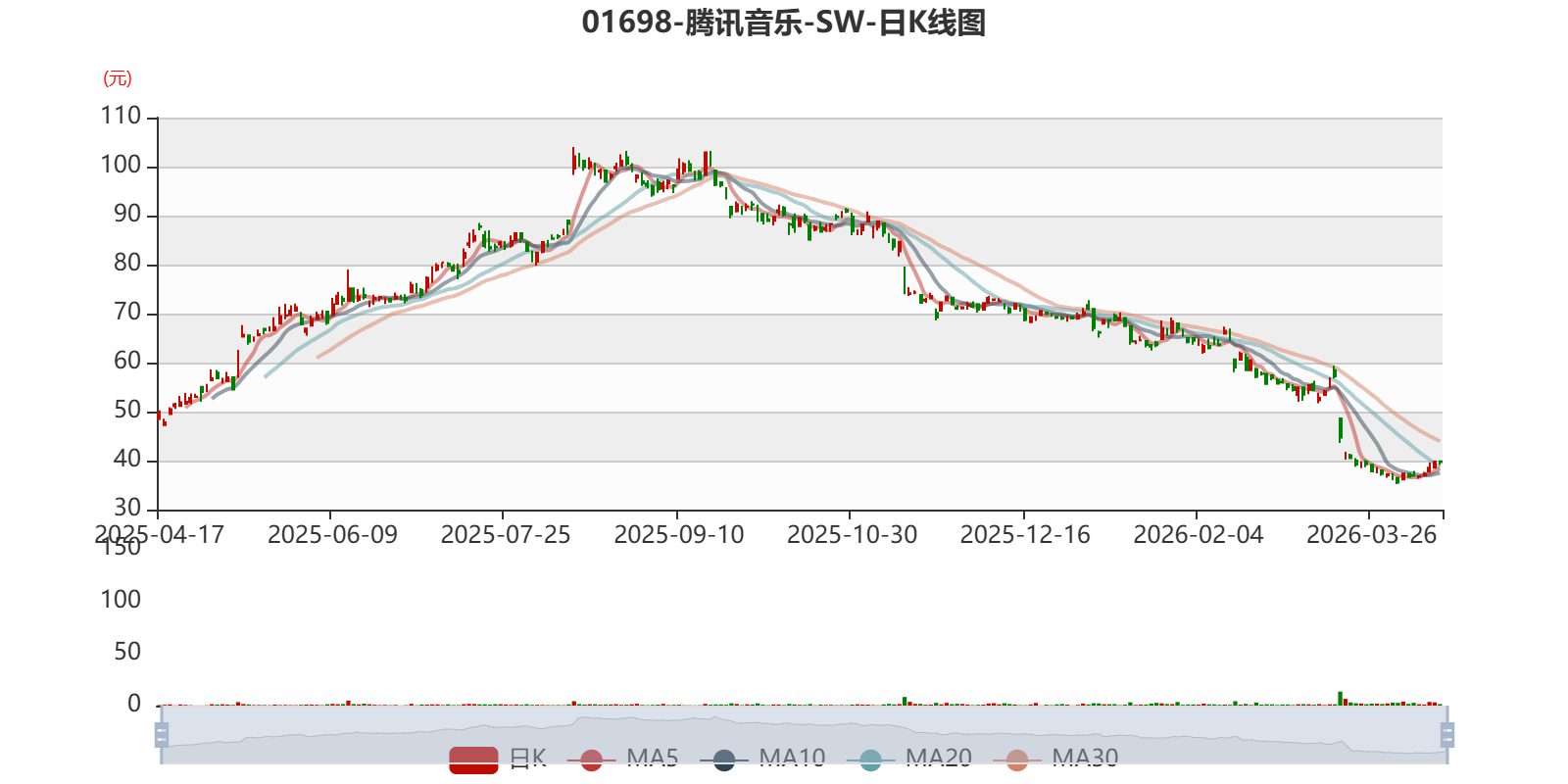 以4月17日收盘价计算,腾讯音乐-SW目前市盈率(TTM)约10.04倍,市净率(TTM)约1.38倍,市销率(TTM)约3.37倍。